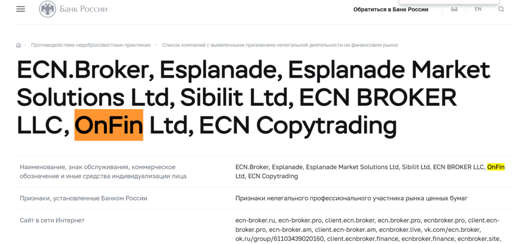 На сайте ЦБ РФ размещено шокирующее предупреждение: «ООО «ОНФИН» осуществляет профессиональную деятельность на финансовом рынке без лицензии». Это не чьи-то домыслы — это официальная позиция главного финансового регулятора страны.